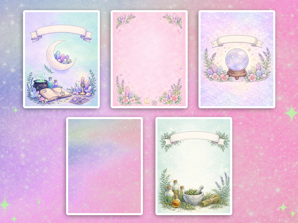 Soft pink leather textures, dreamy crystal ball artwork, and magical pastel backgrounds — clean, aesthetic, and ready to customize.